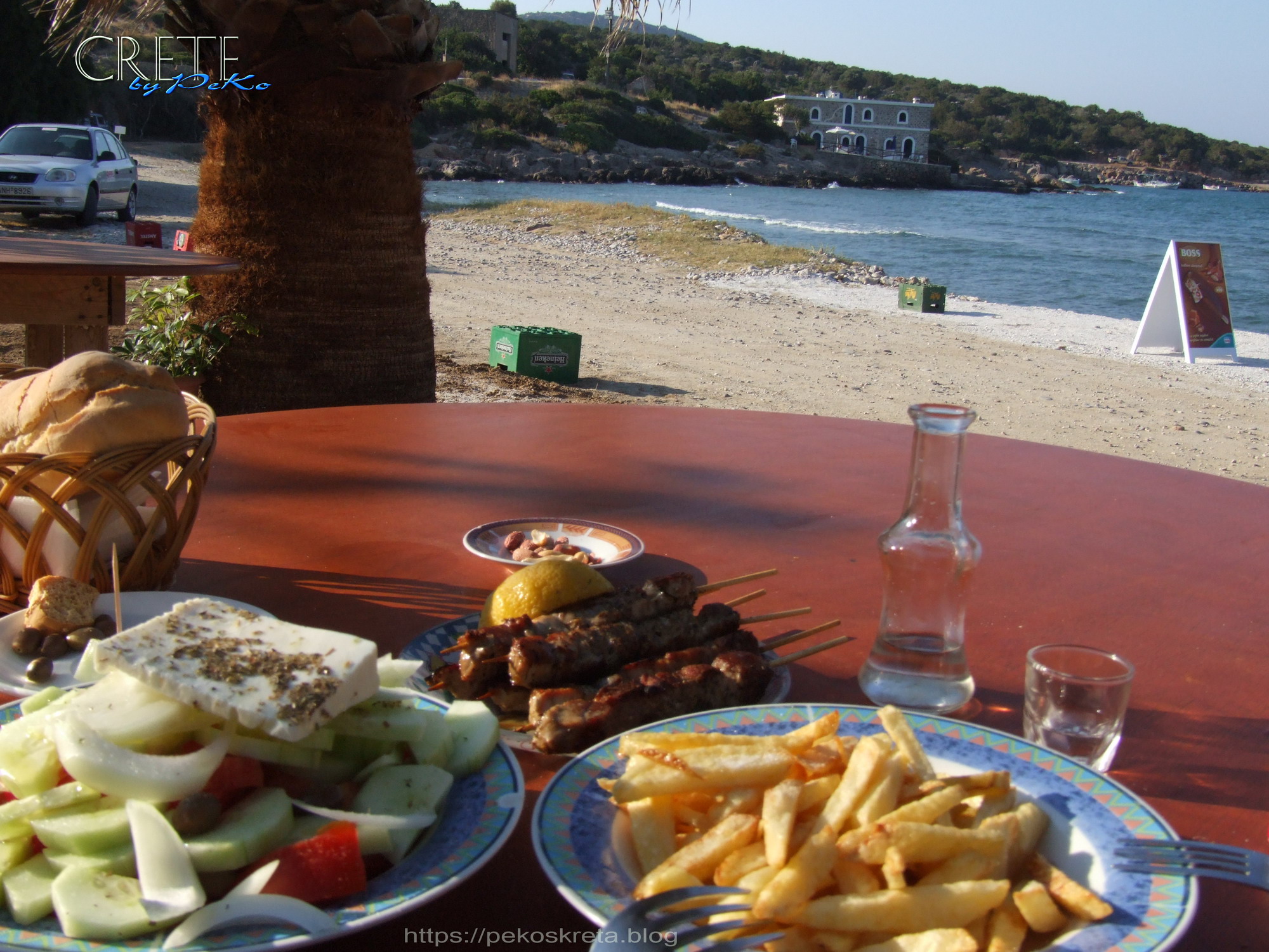 Dort essen wir gerne eine schöne Pikilia (Grillteller mit gemischten Fleischsorten) und einen frischen Choriatiki (Bauernsalat mit Tomaten, Gurken, Feta, Oliven und viiieel Olivenöl) und fettige Pommes Frites. Dazu einen halben Liter einfachen Landwein.