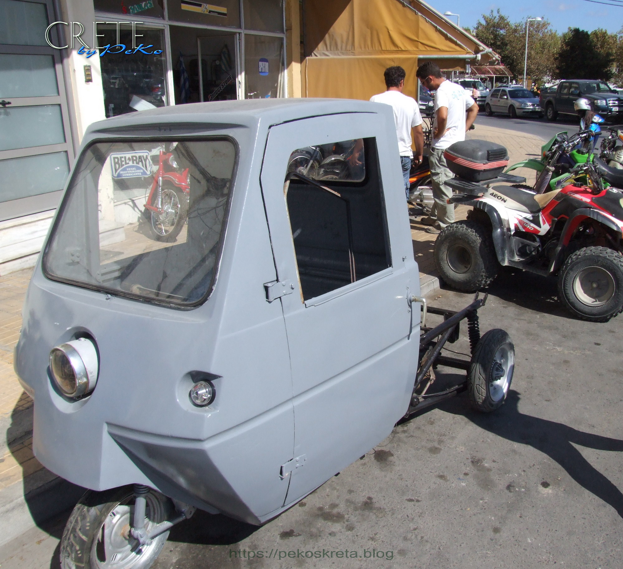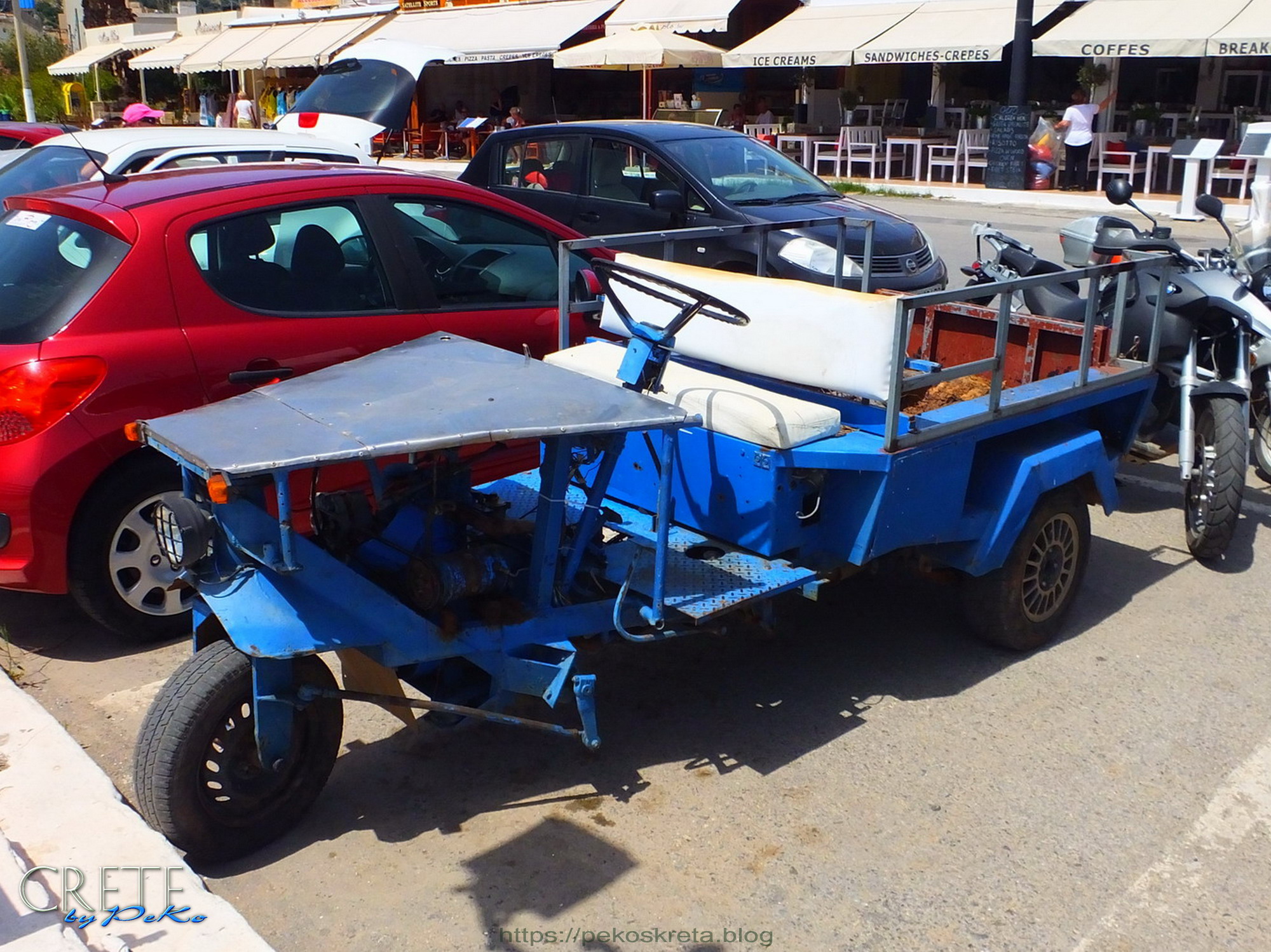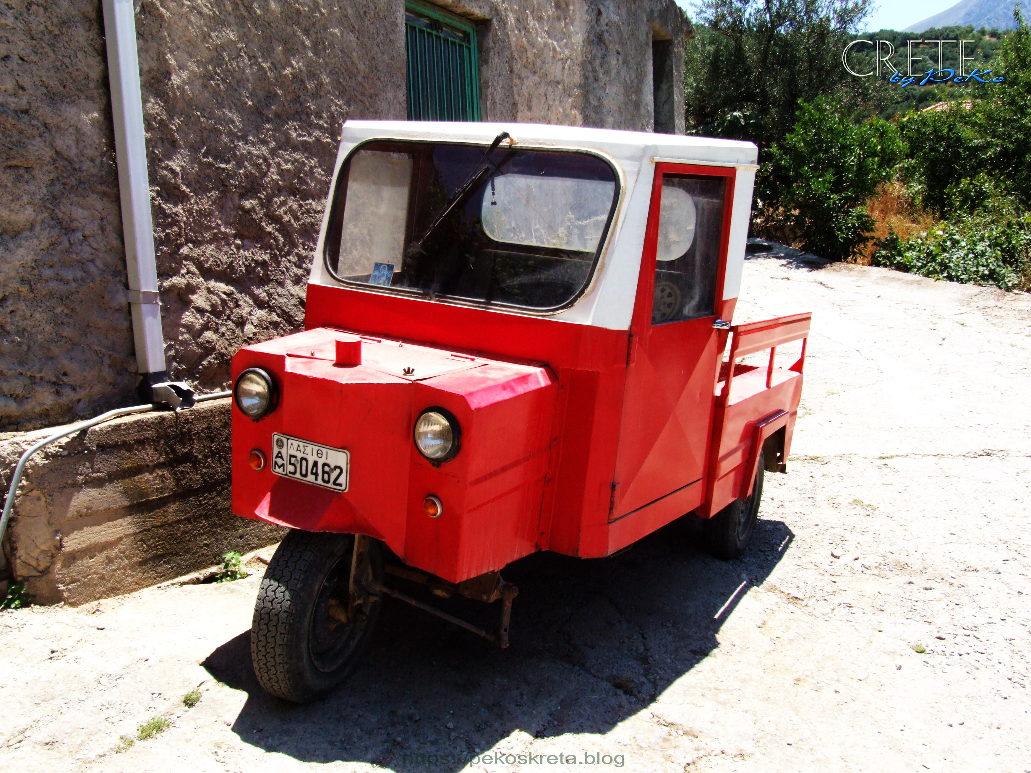 Und so kommt es, daß auch auf Kreta schon mal ein recht ungewöhnliches Fahrzeug langsam an uns vorbeiknattert, welches wie ein selbstgebasteltes Vehikel aus der Nachkriegszeit anmutet, wo es nur darauf ankam ohne eigene Kraftanstrengungen von A nach B fahren zu können . Tatsächlich stammen die heute häufig belächelten Fahrzeuge aber grösstenteils aus heimischer Produktion und revolutionierten in den 1970ern die Arbeit von Bauern und Handwerkern.