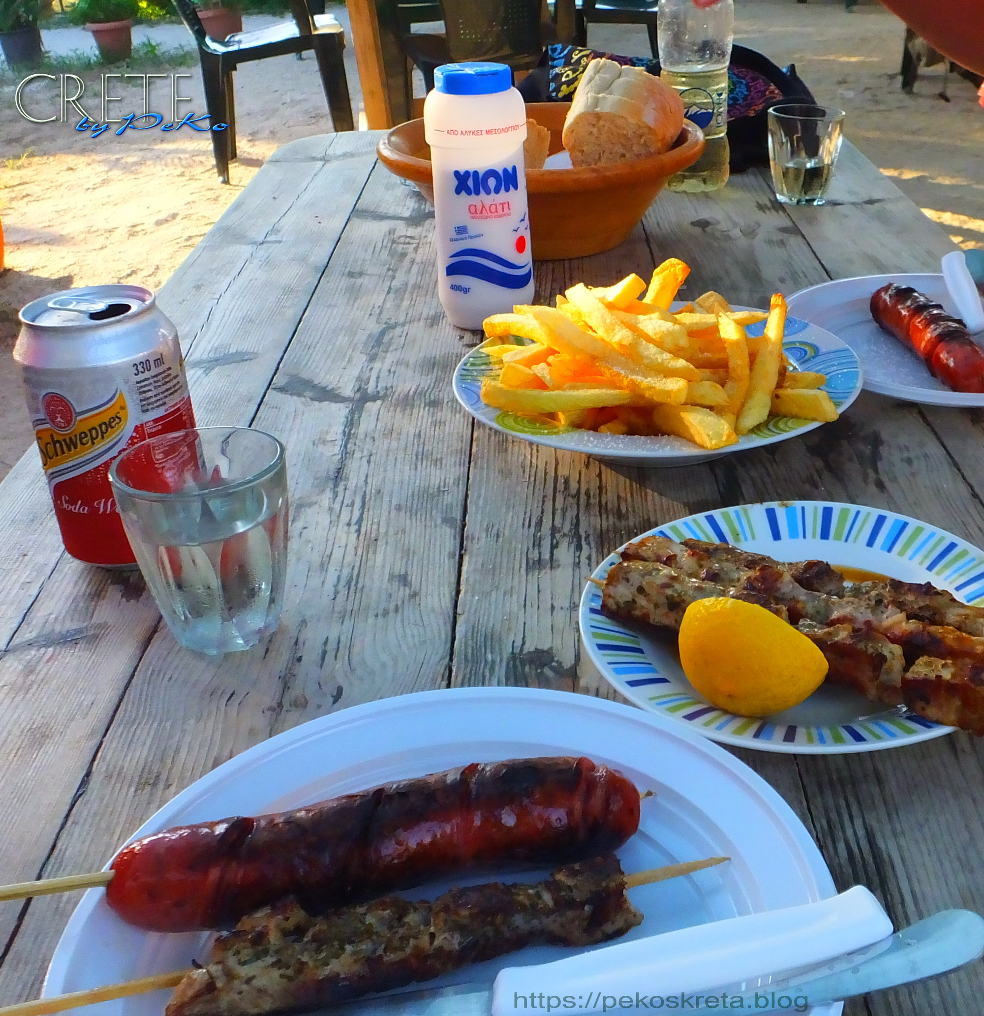 Aber wer nach dem Strandbesuch einmal grösseren Hunger verspürt, der sollte sich die leckeren Fleischspiesse oder eine würzige Choriatiki Loukaniko (kretische Bratwurst) nicht entgehen lassen !