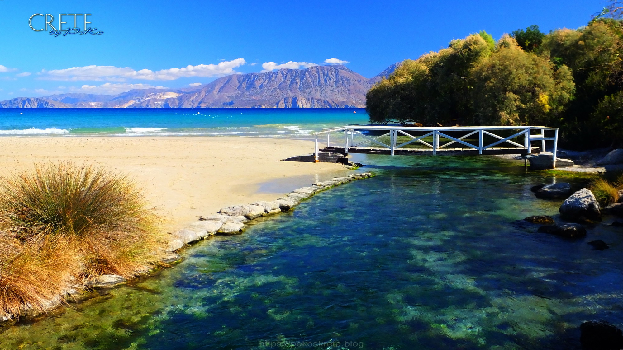 Am östlichen Ende des Strandes mündet der Almyros-Fluss ins Meer, der sich ein paar hundert Meter landeinwärts noch durch ein schilfbewaldetes Sumpfgebiet schlängelt.